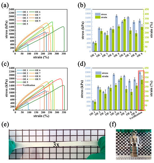 Mechanical performance. (a) Tensile stress–strain curves, and (b) the corresponding stress and strain of MSL hydrogel with different component ratios via orthogonal experimental design. (c) Verification of the optimum MSL and (d) the corresponding stress–strain curves. Optical images showing (e) the excellent stretching of MSL hydrogel and (f) the loading demonstration of MSL hydrogels.