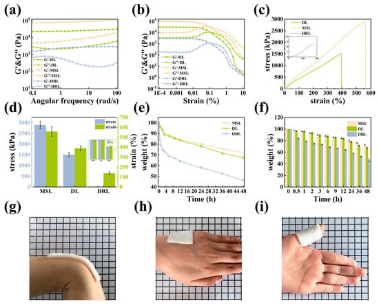 Mechanical performance of the DL hydrogel. (a) The oscillation angular frequency sweep rheological measurement. (b) The oscillation strain amplitude sweep rheological measurement. (c) Tensile stress–strain curves and (d) the corresponding stress and strain of MSL, DL, and DRL hydrogels. (e) Water retention curves and (f) the corresponding weight of MSL, DL, and DRL hydrogels in a chamber at room temperature. Adhesive to (g) wrist and (h) hand. (i) Wrapped around the finger.