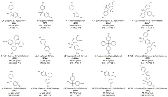 Molecular structure of the fifteen bisphenols with their respective name, abbreviation, molecular weight, and CAS number.