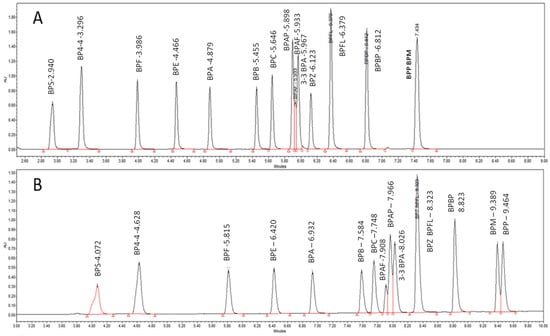 Chromatograms of 15 studied BPs eluted on a BEH C18 column with an AcN/H2O gradient elution (A) and with an MeOH/H2O gradient elution (B).