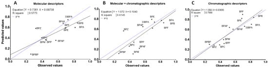 Clearance indices for fifteen BPs were determined on five placentae, corresponding to a total of 75 values. This data set was divided into a training set (55 values, 11 BPs used for model development) and a test set of 20 values corresponding to 4 BPs randomly selected for model predictive assessment. Three prediction data sets were constructed to allow a balanced distribution of the different structures of the BPs. Each BP was allocated to one test set except BPs with high leverage in the multilinear regression model [54,62], i.e., BPS and BPFL for the model using molecular and chromatographic descriptors, BPAF for the model using only molecular descriptors, and BP44 for the model using only chromatographic descriptors. Consequently, data set 1 included BP44, BPB, 3-3BPA, and BPZ in the test set for the validation of the model based on molecular descriptors, and data set 1 included BPAF, BPB, 3-3BPA, and BPZ for the models based on chromatographic descriptors or on both types of descriptors. Data set 2 included BPP, BPM, BPAP, and BPBP in the test set, and data set 3 included BPE, BPA, BPF, and BPC in the test set. The training set was used for multilinear regression, and the corresponding test set was used for the predictive ability validation for the three data sets separately.