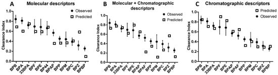 Mean ± SD observed CI determined for the BPs on five perfused human placentae compared to the CI predicted by QSAR models based on molecular descriptors (A), molecular combined with chromatographic descriptors (B), and chromatographic descriptors (C). The placental CI of some BPs cannot be predicted because they are pivotal in building the QSAR model (BPAF, BPFL, BPS in (A), BP44, BPFL, BPS in (B) and (C)).