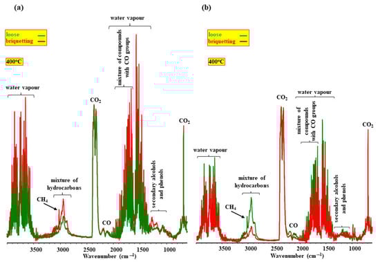 These suggestions on the influence of the porous structure of samples can be proved by research on loose and briquette samples [70]. The results of this research (Figure 1) show that briquetting changes the composition of the volatile products emitted during pyrolysis in a substantial way. Briquetting increases the contribution of saturated and unsaturated hydrocarbons in the composition of the volatile products of the pyrolysis of soft wood and decreases it in the volatile products of sunflower husks. This implies that it is not only the porosity of samples but also other factors that influence the yield of hydrocarbons during pyrolysis.