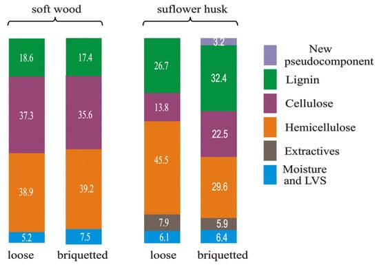 Figure 2 presents the scheme of changes in the contribution ratio of the biomass components of soft wood and sunflower husk samples that were caused by briquetting.