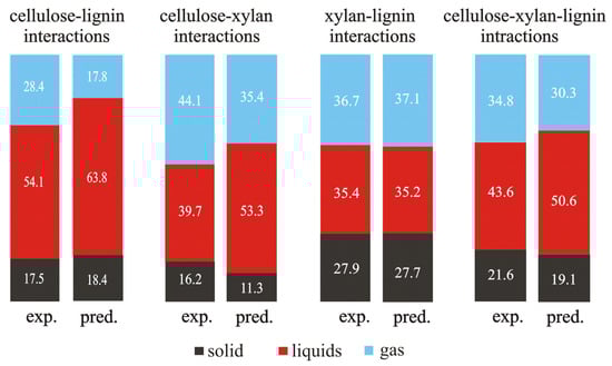 Based on the data taken from [65], Figure 3 presents a comparison between the values of the experimentally measured yields of the solid, liquid, and gaseous products of the blends of single components and the predicted values of yields calculated according to the additivity rule.