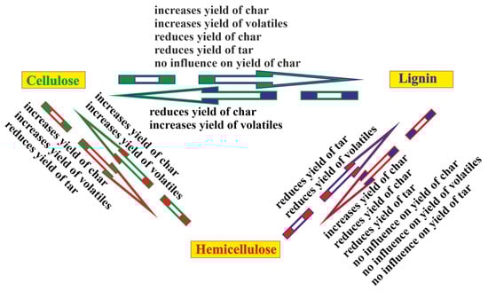 The effects of the interactions between the basic biomass components: cellulose increases yield of char (data from [41,48,57]); increases yield of volatiles (data from [52,60,67]); reduces yield of char (data from [52]); reduces yield of tar (data from [41,56,57]); no influence on yield of char (data from [55,59]); lignin reduces yield of char (data from [58]); increases yield of volatiles (data from [56]); hemicellulose reduces yield of tar (data from [52]); reduces yield of volatiles (data from [43]); lignin increases yield of char (data from [43]; reduces yield of char (data from [67]); reduces yield of tar (data from [58]); no influence on yield of char (data from [65]); no influence on yield of volatiles (data from [65]); no influence on yield of tar (data from [65]); hemicellulose increases yield of char (data from [43]); increases yield of volatiles (data from [51]); cellulose increases yield of char (data from [43]); increases yield of volatiles (data from [44,56,66]); reduces yield of tar (data from [44,65]).