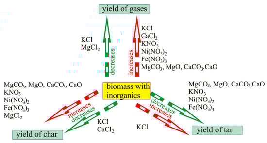 Summarizing all the above, it should be underlined that inorganic components both present in biomass and added during impregnation cause ambiguity in statements made by different authors. Figure 5 generalizes the influence of inorganic components used during impregnation on the yield of pyrolysis products.