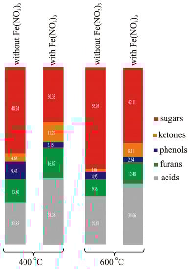 The changes in the contents of sugars, ketones, phenols, furans, and acids in the volatile products of the pyrolysis of Chinese chestnut shells caused by an increase in temperature from 400 °C to 600 °C and the addition of Fe(NO3)3 (based on data from [89]).