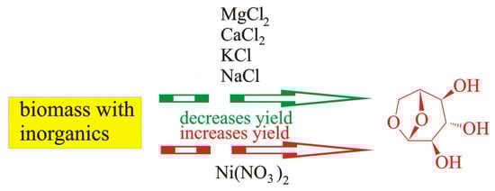 Contradictions presented in opinions expressed by different authors concern the influence of inorganics on the yield of levoglucosan. For example, according to the authors of the works [49,91,103,104,105], the interactions of Na, K, Ca, and Mg atoms with biomass components lowered the yield of levoglucosan whereas Ni atoms increased it [96]. The investigations of the influence of inorganics on the formation of levoglucosan include the pyrolysis of native biomass [91,94,96] as well as the pyrolysis of cellulose [49,95,96] as main providers of this compound.