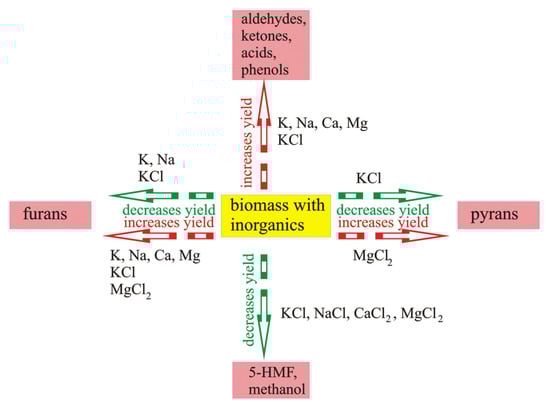 The influence of inorganic components on the yield of selected compounds: increase in yield of aldehydes, ketones, acids, and phenols influenced by K, Na, Ca, and Mg (data from [105]); KCl (data from [100]); decrease in yield of pyrans influenced by KCl (data from [91]); increase in yield of pyrans influenced by MgCl2 (data from [98]); decrease in yield of 5-HMF and methanol influenced by KCl, NaCl, CaCl2, MgCl2 (data from [104]); decrease in yield of furans influenced by K, Na (data from [49]); KCl (data from [91]); increase in yield of furans influenced by K, Na, Ca, and Mg (data from [105]); KCl (data from [100]); MgCl2 (data from [98]).