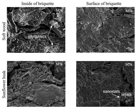 Figure 9 presents the SEM images of the inside and surface of the briquettes of pyrolyzed samples of soft wood and sunflower husk.