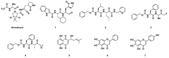Examples of different chemical classes of SARS-CoV-2 Mpro inhibitors. A covalent mechanism of action was observed for Mpro inhibitors bearing electrophilic fragments, such as aldehydes (1), α-ketoamides (2), fluoromethyl ketones (3), and epoxyketones (4). A non-covalent inhibition of Mpro was reported for 5, 6 and 7.