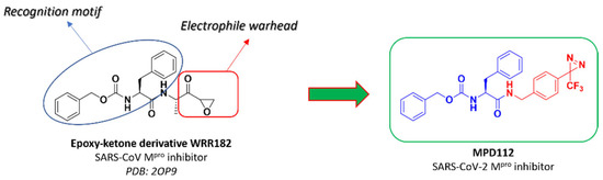 The design of our inhibitor MPD112 was accomplished starting from the analysis of the crystallographic structure of an epoxyketone inhibitor WRR182 with SARS-CoV Mpro (Figure 2) [15]. The N-terminal carbobenzyloxy-phenylalanine residue has often been representative of several peptide-based inhibitors of SARS-CoV-2 Mpro described in the literature, especially α-fluorinated ketones and epoxyketones [16]. Therefore, we decided to maintain such functionality in the structure of the final compound and implemented the replacement of the epoxyketone moiety of the lead compound with the diazirine scaffold, connecting the latter to the steady fragment via an amide bond and a benzyl linker (Figure 2).