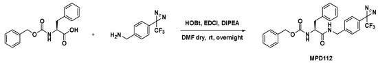 The synthesis of MPD112 was carried out following an easy amide coupling between Z-Phe-OH and 4-[3-(trifluoromethyl)-3H-diazirin-3-yl]benzylamine hydrochloride, mediated by HOBt/EDCI/DIPEA in dry DMF, as reported in Scheme 2. Characterization of the compound by 1H, 13C NMR and HRMS confirmed the desired structure. Its purity (>95%) was assured by HPLC analysis. The diazirine building block was synthesized according to a previously reported procedure [17]. Copies of NMR and MS spectra, together with HPLC traces, are included in the Supplementary Materials.