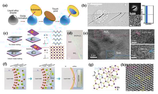 - Zavabeti, A.; Ou, J.Z.; Carey, B.J.; Syed, N.; Orrell-Trigg, R.; Mayes, E.L.; Xu, C.; Kavehei, O.; O’Mullane, A.P.; Kaner, R.B.; et al. A liquid metal reaction environment for the room-temperature synthesis of atomically thin metal oxides. Science 2017, 358, 332–335. [Google Scholar] [CrossRef]