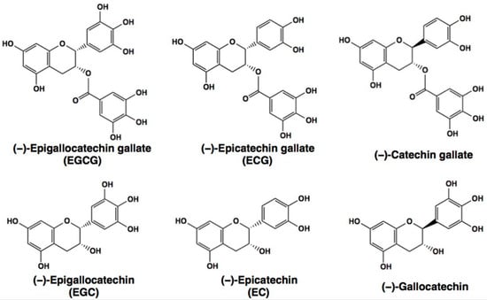 Chemical structures of (−)-epigallocatechin gallate (EGCG) and related catechins. ECG, (−)-epicatechin gallate; EGC, (−)-epigallocatechin, EC, (−)-Epicatechin.