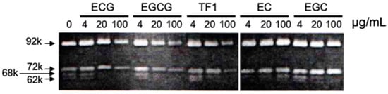 Gelatin zymography reveals that EGCG inhibited ProMMP2 (72k), activated MMP2 (68k and 62k), and MMP9 (92k). TF1, theaflavin-1. Reprinted with permission from Ref. [44]. Copyright 1999 American Chemical Society.