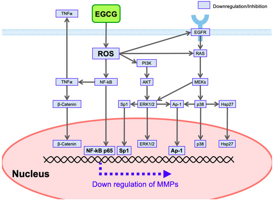 In nasopharyngeal carcinoma TW01 and NA cells, EGCG inhibited cell proliferation, migration, and Matrigel invasion [50]. EGCG also reduced the phosphorylation of ERK and the nuclear levels of AP-1 and Sp1, leading to the downregulation of MMP2 and MMP9. EGCG inhibited the nuclear translocation of NF-κB and β-catenin along with the reduction of mRNA levels of epidermal growth factor receptor (EGFR). EGCG upregulated the expression of E-cadherin and β-catenin. EGCG caused inhibition of AKT phosphorylation to a lesser extent and no changes in the level of p38. The expression of MMP2 and MMP9 is regulated by several signaling pathways, including MAPK and PI3K/AKT signaling pathways affecting the downstream transcription factor AP-1 and Sp1 that modulates the promoter activity of MMP2 and MMP9 [51].