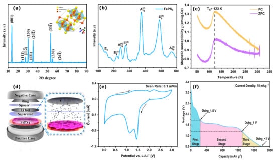 (a) X-ray diffraction pattern, (inset: geometric model of FePS3 molecule with octahedral voids), (b) Raman characterization, and (c) vibrating sample magnetometer (VSM) analysis of as-synthesized FePS3. χ vs. T plot for pristine FePS3 in the temperature range of 50–300 K under an applied magnetic field of H = 100 Oe. FC and ZCF represent field cooling and zero field cooling, represented by blue and green solid lines. (d) Schematic representation of lithium primary battery with FePS3 nanoflakes as cathode. (e) CV plots at 0.1 mV s−1. (f) Galvanostatic full-discharge profile of FePS3 cathode with proposed three-stage mechanism.