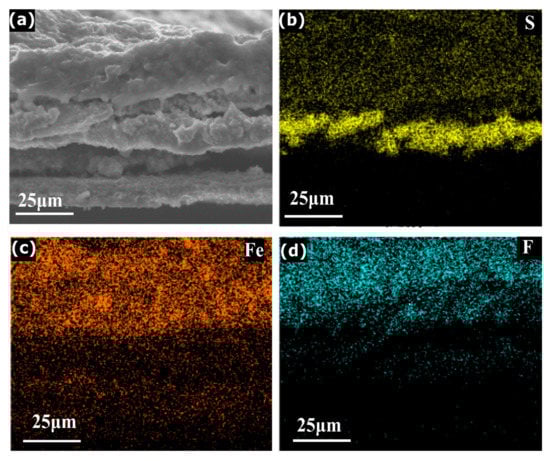 SEM and EDS mapping analysis of a cross-section of the FePS3 electrode discharged till 0.5 V: (a) secondary electron image of SEM and (b) S (yellow), (c) Fe (orange) and (d) F (blue) elemental mapping using EDS.