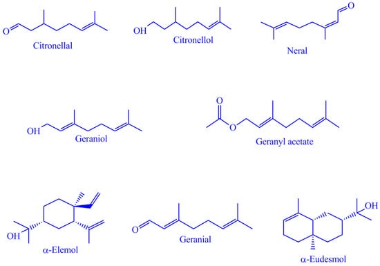 Cymbopogon martini (palmarosa) is an important, multiharvest, perennial, ad aromatic grass native to India. India is the principal producer and exporter of palmarosa EO [27,28,29]. EO of palmarosa is generally distilled (more frequently by steam or hydro-distillation) from the leaves, stems, flowers, bark or roots, or other elements of the plant [30]. The EO of palmarosa mainly consists of monoterpenoid components [31] such as citral, citronellol, and geranyl acetate [32], which is why these oils are mostly used as a culinary flavoring in Asia [33,34,35] and have demonstrated remarkable bioactivities, including herbicidal activity [36]. Moreover, the most important use of palmarosa is in the treatment of skin infections such as acne and also to stimulate cell regeneration while regulating the production of sebum [37].
