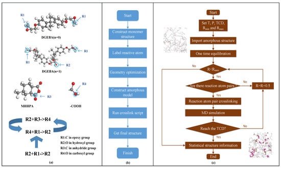 Simulation of epoxy resin crosslinking process (a) Atomic calibration names and reaction rules (b) Flow chart of structure construction (c) Flow chart of crosslinking script and partial structure before and after crosslinking [66].