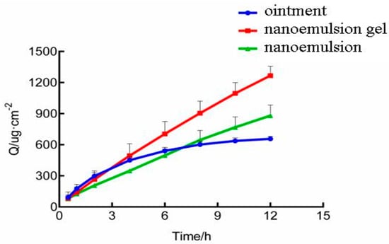 The abdomens of the SD rats (Male, 200 ± 20 g) were depilated one night before the experiment, and the rats were euthanized the next day. The abdominal skin of the SD rats was scraped clean with a scraper for standby. A Franz diffusion cell was used, and the receiving solution was PBS (pH = 7.4, containing 20% absolute ethanol). Then, 0.5 g of TPL nanoemulsions and nanoemulsion−based gels or ointment was placed into the supply cell of the Franz diffusion cell, and the transdermal experiment was conducted at the condition of 37 ± 1 °C, 300 r/min; the samples were taken at the specified 1 h time point. At 2, 4, 6, 8, 10, and 12 h, 1 mL of receiving solution was removed (adding 1 mL PBS at the same time), the sample was centrifuged at 10,000 r/min for 5 min, and the supernatant of the sample was taken after centrifugation for detection. Then, the cumulative percutaneous permeability Qn area was calculated as follows: