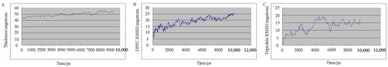 In this simulation, the RMSD value reflects the degree of deviation of each atom of the biofilm from the average position, which is the size of the motion amplitude of each atom. The RMSD value is increased with the spatial range of the atom motion [29,30].