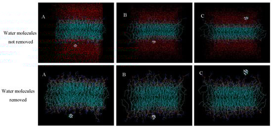 Using the CHARMM−GUI platform to build a DPPC bilayer organism, the following steps were followed to build a membrane: read the coordinates, determine the orientation, determine the size of the system, establish the composition, assemble thecomposition, and balance the system of the lipid bilayer [24,25,26]. During the modeling process, the selection of relevant parameters in the system was as follows: the upper and lower layers of the DPPC bilayer were 100 DPPC molecules, and each DPPC lipid molecule was attached to 50 water molecules. The sizes of the upper and lower layers of DPPC lipids were 6300 g. The size ratio of the X axis to Y axis was selected as 1:1. M NaCl (physiological ion concentration) was selected to ensure the electrical neutrality of the system. Finally, a series of input files were generated, which could be divided into job descriptions, adjustable parameters, simulation parameters, extra parameters, execution scripts, etc [27].