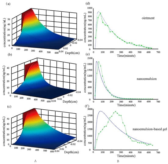 Two−layer model numerical simulation of the triptolide drug delivery system in a three−dimensional map: (a–c) ointment, nanoemulsion, and nanoemulsion−based gel, respectively. Comparison between experimental data and numerical results: (d–f) ointment, nanoemulsion, and nanoemulsion−based gel, respectively.