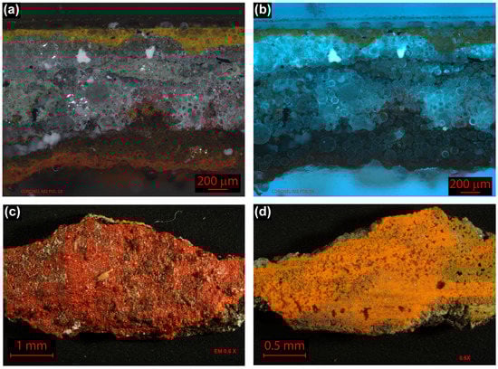 Figure 2a is a micrograph of the cross section of the sample with polarized light, where six layers can be distinguished: the first layer is yellow, followed by a greyish layer, then a dark red color and finally the red surface paint layer. In all the samples, an agglomeration of spherical structures is observed. Figure 2b shows the cross section of the sample with a UV filter from 460 to 490 nm, where the intermediate gray layer, identified in Figure 2a, presents different fluorescence caused by the overlay of rich binder layers and fillers, and pigments layers. Whitish regions with increased fluorescence that could be attributed to pigments or inorganic fillers are evident. The artist did not use a ground preparation for this mural; he applied, directly onto the support, the different layers of paint, where the surface paint layer was red (obverse side) (Figure 2c) and the first was a yellow layer (reverse side) (Figure 2d). The yellow painting layer has a flat surface because this side was attached to the panel.