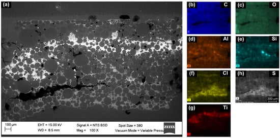 (a) SEM micrograph (BSE, 15.0 kV, 100×, area studied approximately 3000 × 1800 microns). Elemental mappings (EDS, 15.0 kV, 100×) of predominant elements: (b) C, (c) O, (d) Al, (e) Si, (f) Ti, (g) Cl and (h) S.