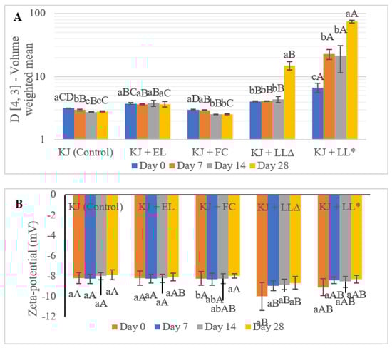 The particle size (D [4, 3]-Volume weighted mean (µm)) (A) and the zeta potential (B) of kiwifruit juice containing empty and green tea waste extract (GTWE)-loaded single layer liposomes (SLLs) during storage (4 °C). KJ: control kiwifruit juice; KJ + FC: kiwifruit juice containing free GTW catechins; KJ + LL∆: unpasteurised kiwifruit juice enriched with GTWE-loaded SLLs; KJ + LL*: pasteurised kiwifruit juice containing GTWE-loaded SLLs. Different lowercase letters indicate significant (p < 0.05) differences among the same kiwifruit juice samples for different storage times; Different capital letters stand for statistically significant (p < 0.05) differences among different kiwifruit juice samples on the same storage day.
