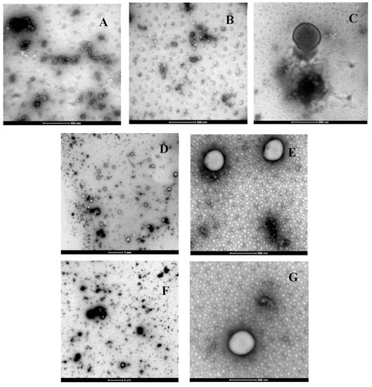 Transmission electron micrographs of the kiwifruit juice fortified with (A) no liposomes, (B) free green tea waste extract (GTWE), (C) empty liposomes, (D,E) GTWE-loaded single layer liposomes (SLLs) without pasteurisation, and (E,F) GTWE-loaded SLLs with pasteurisation. Magnification: 6000× for (D,F) and 43,000× for (A–C,E,G).