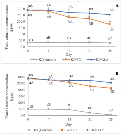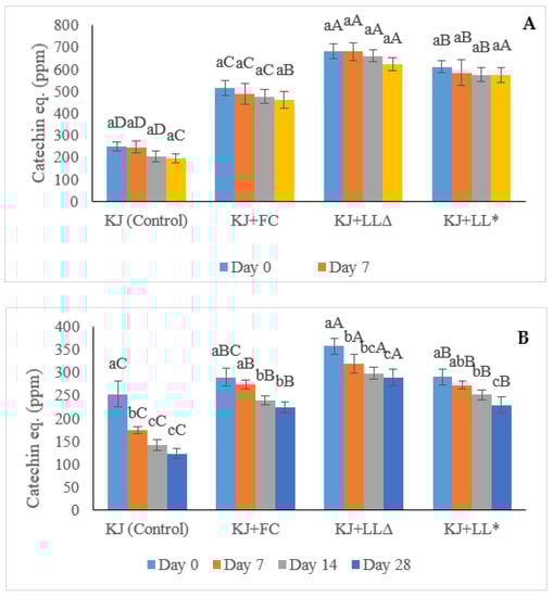 Total catechin concentration (ppm) of the control kiwifruit juice vs. unpasteurised (A,B) and pasteurised kiwifruit juice samples, analysed by high-performance liquid chromatography (HPLC). KJ: control kiwifruit juice; KJ + FC: kiwifruit juice containing free green tea waste catechins (GTWCs); KJ + LL∆: unpasteurised kiwifruit juice enriched with green tea waste extract (GTWE)-loaded single layer liposomes (SLLs); KJ + LL*: pasteurised kiwifruit juice containing GTWE-loaded SLLs. Different lowercase letters indicate significant (p < 0.05) differences among the same kiwifruit juice samples for different storage times. Different capital letters stand for statistically significant (p < 0.05) differences among different kiwifruit juice samples on the same storage day.