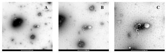 Transmission electron microscopy (TEM) was used to examine the morphology of the manufactured liposomes. The sample preparation using the negative staining technique was slightly modified from the method developed by Ruozi et al. []. Liposome samples were diluted 20 times before placing a small droplet (~80 µL) on the parafilm. A 200-mesh formvar copper grid (Agar Scientific Ltd., Essex, UK) was placed into the liposome droplet for 4 min. To stain the grid, a drop of 2% uranyl acetate was placed on the parafilm and the grid (coated with liposomes) was incubated in the solution for 4 min. The stained copper grid needed approximately 2 min for drying at room temperature. Finally, the microstructure of the liposomes was seen under TEM (FEI Tecnai G2 Spirit BioTWIN, Brno-Černovice, Czech Republic) at 100 kV. A Veleta CCD camera (Olympus Soft Imaging Solutions, Munster, Germany) was used to capture the images.
