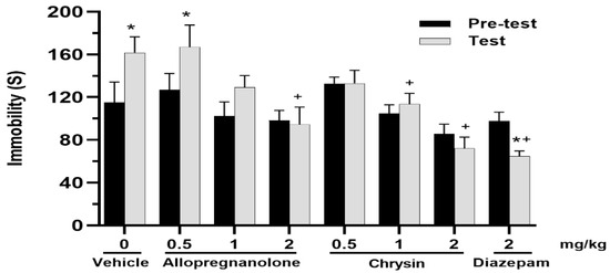 Total time of immobility. Immobility increased from pre-test to test session in vehicle and allopregnanolone (0.5 mg/kg) groups, while no changes were detected in allopregnanolone (1 and 2 mg/kg) and chrysin (all evaluated doses) groups. In the test session, chrysin (1 and 2 mg/kg), allopregnanolone (2 mg/kg) and diazepam significantly reduced the immobility time with respect to vehicle in the test session. * p < 0.05 vs. same group in pre-test session, + p < 0.05 vs. vehicle in the test session. Data are represented as mean ± standard error. Two-way repeated measures ANOVA, post hoc Student–Neuman–Keuls.