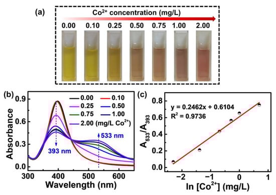 The sensing of Co2+ was performed at room temperature. Briefly, 2.4 mL of Co2+-containing solution of different concentrations and 0.6 mL PVP-AgNPs dispersion were mixed in a colorimetric tube. After incubating for 2 min, the samples were analyzed using an optical spectrometer (UV2600i, Shimadzu, Kyoto, Japan). In the absorption spectroscopy, the peak intensity at 533 nm (A533 nm) and the peak intensity at 393 nm (A393 nm) represent the degree of aggregation and dispersion of nanoparticles, respectively. The absorbance ratio of A533 nm/A393 nm was used as the parameter for Co2+ detection [26,50].