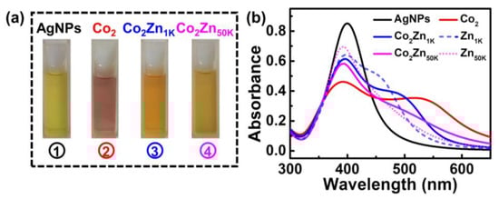 Discouragingly, addition of Zn2+ leads to a shocking change in both the color and the UV-vis signals of the solution, meaning a devastating influence on the PVP-AgNPs in terms of sensing the trace Co2+. As shown in Figure 2a, addition of Co2+ into the PVP-AgNPs suspension turns the color from light yellow to light purple. However, co-addition of Co2+ and Zn2+ results in the disappearance of the purple color, being replaced with the orange (Co2Zn1K, namely the solution containing 2 mg/L Co2+ and 1 g/L Zn2+) or dark yellow (Co2Zn50K, namely the solution containing 2 mg/L Co2+ and 50 g/L Zn2+) images. The results indicate that the existence of Zn2+ in the solution can interfere with the sensing of trace Co2+. This deduction is also demonstrated in the UV-vis spectra. As show in Figure 2b, compared with single Co2+, co-existence of Co2+ and Zn2+ (Co2Zn1K and Co2Zn50K) leads to a dramatic change in the absorption spectrum shape, including peak intensity and position, which implies that Zn2+ in the solution influences the aggregation degree of particles to a large extent. Compared with single Zn2+ (Zn1K and Zn50K), Co2Zn1K and Co2Zn50K also showed a discernable change in absorption spectrum shape. This means that when the concentration of Zn2+ is significantly higher than that of Co2+ (the concentration ratio of Zn2+ to Co2+ is 500:1 and 25,000:1, respectively), the addition of Co2+ can still affect the aggregation state of particles.