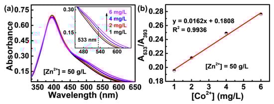 The absorption intensity ratio between the newly appeared peak (533 nm) caused by analytes and the initial PVP-AgNPs peak (393 nm) is commonly used for the quantitative determination of trace ions using the colorimetric method [26,33]. As shown in Figure 3b, a good linear relationship between A533/A393 and Co2+ concentration in the range of 1–6 mg/L is found (y = 0.0162x + 0.1808, R2 = 0.9936), which means that the concentration of trace Co2+ in the 50 g/L Zn2+ solution can be precisely determined. As has been documented, the maximum tolerable level of cobalt is 0.3–2 mg/L for typical zinc smelting plants across China [34], and 0.05–1 mg/L for zinc smelters in other countries [35]. Therefore, the detection range of 1–6 mg/L enables the fabricated PVP-AgNPs to monitor the Co2+ concentration during normal operation or alarming for exceeding limits of Co2+ concentration in zinc smelting plants.