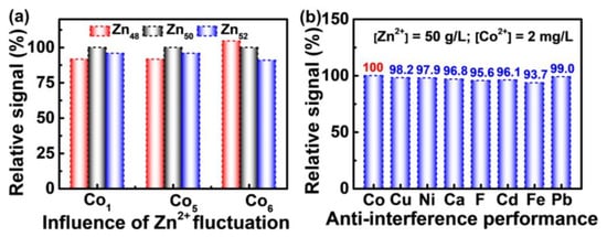 (a) Effect of Zn2+ concentration fluctuation on Co2+ response signal. (b) The influence of interfering ions: [Zn2+] = 50 g/L, [Co2+] = 2 mg/L, [Cu2+] = 0.5 mg/L, [Ni2+] = 1 mg/L, [Ca2+] = 800 mg/L, [F−] = 50 mg/L, [Cd2+] = 0.1 mg/L, [Fe2+] = 2 mg/L, [Pb2+] = 0.05 mg/L. The Y-axis “Relative signal (%)” represents the relative values of absorbance ratio between reference and experimental values ((A533/A393)ref/(A533/A393)exp): (a) 50 g/L Zn2+ was set as reference, and 48 g/L and 52 g/L as the experimental group; (b) the mixture of 50 g/L Zn2+ and 2 mg/L Co2+ was set as reference, a third metal ion introduced into the Zn−Co mixture system was set as the experimental group.