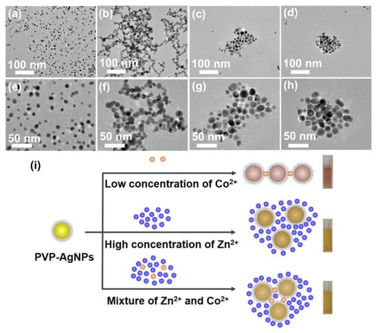 TEM micrograph and size distributions: (a,e) PVP-AgNPs in pure water free of metal ions; (b,f) PVP-AgNPs in the presence of 2 mg/L Co2+; (c,g) PVP-AgNPs in the presence of 50 g/L Zn2+; (d,h) PVP-AgNPs in the co-existence of 2 mg/L Co2+ and 50 g/L Zn2+. (i) Illustration of the particle behaviors of PVP-AgNPs in various solutions.