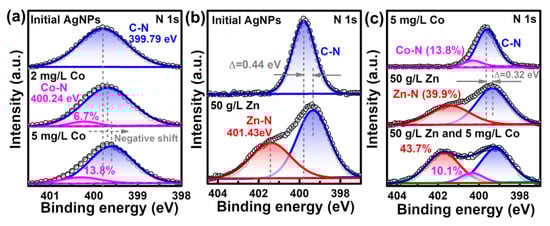 The surface interactions for enabling the sensing of trace Co2+ in high-concentration Zn2+ solution is again manifested by the XPS results. As shown in Figure 8a, the initial PVP-AgNPs solution only had a symmetric single peak at 399.79 eV, corresponding to the C–N bond of the coating agent PVP [44,45]. Addition of Co2+ induces the generation of a new Co–N peak at 400.24 eV (Figure 8a) [46], with the bonded nitrogen being increased from 6.7% for 2 mg/L Co2+ to 13.8% for 5 mg/L Co2+. The results indicate that the added Co2+ is bonded with the PVP on the surface of the AgNPs, inducing the aggregation of PVP-AgNPs [29]. Similarly, the added Zn2+ also bonded with the superficial PVP on AgNPs, as shown by the generation of a Zn–N bond at 401.43 eV (Figure 8b) [47]. The concentration of added Zn2+ (50 g/L) is much higher than that of Co2+ (2 mg/L), which provides more metal ions for bonding with the nitrogen in PVP for the former case, thus resulting in a much higher peak intensity of Zn–N than that of Co–N. Obviously, the competing bonding with nitrogen between Zn2+ and Co2+ means that the detection of trace Co2+ by PVP-AgNPs can be interfered with by the dominant Zn2+. Compared with solely adding 50 g/L Zn2+, further introducing 5 mg/L Co2+ again generates the Co–N peak (Figure 8c), which indicates that the smooth bonding of trace Co2+ with PVP-AgNPs in high-concentration Zn2+ solution can still proceed. Therefore, the sensing detection of Co2+ is still feasible in high-concentration Zn2+ solution. It should be mentioned that the bonded nitrogen by Co2+ decreases from 13.8% in 5 mg/L Co2+ solution (Figure 8a) to 10.1% in 5 mg/L Co2++ 50g/L Zn2+ solution (Figure 8c), again substantiating that occupation of the active nitrogen-containing sites in PVP by Zn2+ can mitigate the interaction between Co2+ and PVP-AgNPs.