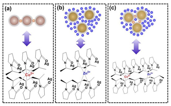 The coordination modes of PVP-AgNPs with metal ions in various solutions: (a) Co2+; (b) Zn2+; (c) mixture of Co2+ and Zn2+.