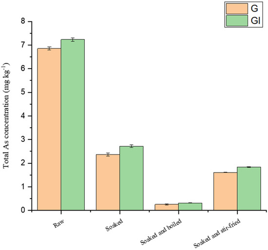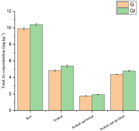 - Liao, W.; Wang, G.; Li, K.; Zhao, W. Change of As Speciation in Shellfish after Cooking and Gastrointestinal Digestion. J. Agric. Food Chem. 2018, 66, 7805–7814. [Google Scholar] [CrossRef] [PubMed]