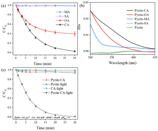 (a) Degradation of APAP in the presence of different low-molecular-weight carboxylic acids (maleic acid (MA), succinic acid (SA), oxalic acid (OA), and citric acid (CA)). Initial conditions: [pyrite] = 0.1 g L−1, [APAP] = 30 μM, [LMWCA] = 1 mM, pHini = 6. (b) UV–Vis absorption spectra of the reaction solutions in the presence of different low-molecular-weight carboxylic acids. Initial conditions: [pyrite] = 0.1 g L−1, [LMWCA] = 0.6 mM, pHini = 6. (c) Degradation of APAP in different systems with or without CA. Initial conditions: [pyrite] = 0.1 g L−1, [APAP] = 30 μM, [CA] = 0.6 mM, pHini = 6.