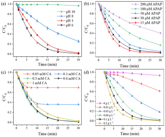 Effect of (a) initial pH, (b) initial APAP concentration, (c) initial CA concentration and (d) pyrite dosage on APAP degradation in the pyrite–CA–light system. Initial conditions: [pyrite] = 0.1 g L−1, [APAP] = 30 μM, [CA] = 0.6 mM, pHini = 6.