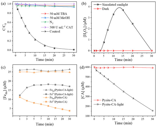 In order to further verify the in situ generation of H2O2, concentrations of H2O2 in the presence of pyrite and CA with or without irradiation were measured. As demonstrated in Figure 3b, the concentration of H2O2 increases first and then decreases in the pyrite–CA–light system with a maximum value of ca. 4 μM, while no H2O2 is determined in the pyrite–CA system in the dark, which is consistent with the result in Figure 1c. In addition, the terephthalic acid (TA)-trapping protocol was employed to detect the generation of HO• in pyrite–CA–light. As shown in Supplementary Materials Figure S6, the fluorescence intensity increased with the process of the reaction, indicating the continuous formation of HO• in the pyrite–CA–light system. To further probe the mechanism, concentrations of dissolved Fe(II) and total iron in the system with or without irradiation were determined, and the concentration of Fe(III) is the difference between the concentration of total iron and Fe(II). Interestingly, there is no significant difference between these two systems not only in the total iron (ca. 25 μM) throughout the reaction, but also in the Fe(II)/Fe(III) ratio (ca. 1:1) at the initial stage of reaction (1 min) (Figure 3c). However, the Fe(II)/Fe(III) ratio varies in different modes, i.e., Fe(II) continuously decreases in the dark, while it obviously increases first and then slightly falls back under irradiation. This difference indicates that the photoinduced Fe(II)/Fe(III) redox cycle occurs in the pyrite–CA–light system.