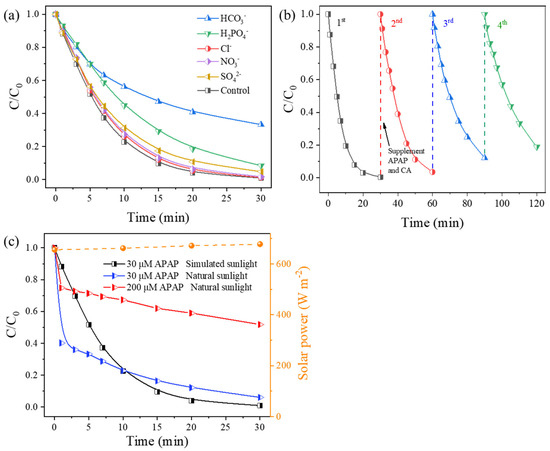 To evaluate the effectiveness of the established system in utilizing natural sunlight, photodegradation of APAP was performed on the rooftop of the lab building under natural sunlight from 11:00 to 13:00 on 1 November 2022 (solar radiance received was about 650 W m−2) (Supplementary Materials Figure S8). As shown in Figure 4c, APAP degradation occurs efficiently and is much faster in the first 5 min of the reaction. At the reaction time of 30 min, degradation efficiencies of APAP at 30 and 200 μM are 93.9% and 48.2%, respectively, which are lower than those under the applied Xe lamps. Shortwave irradiation in the natural sunlight (i.e., UVB and UVA) facilitates APAP degradation in the initial stage of reactions in the pyrite–CA–light system, but it accelerates CA depletion simultaneously. This indicates that the pyrite–CA–light system is also suitable for natural sunlight conditions, but a rational strategy for maintaining a high degradation rate is replenishing CA at the proper time, especially for the purpose of treating a higher concentration of pollutants.