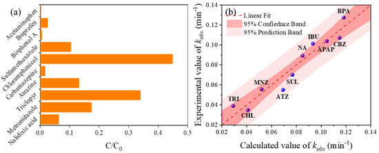 Ten typical PPCPs were selected to investigate the effectiveness of the pyrite–CA–light system for treating organic pollutants. Figure 5a shows that except for carbamazepine and triclopyr, the degradation efficiency of PPCPs is above 80% within 30 min. However, the photodegradation efficiency of PPCPs varies with their molecular structures significantly. To understand the degradability of these PPCPs, the octanol–water partition coefficient (lgKOW), dissociation constant (pKa) and highest occupied molecular orbital (HOMO) energy were selected as descriptors for performing multiple linear regression (MLR) with kobs to construct the quantitative structure–activity relationship (QSAR) model. lgKOW and pKa were calculated using PubChem (https://pubchem.ncbi.nlm.nih.gov (accessed on 16 December 2022)) [39], HOMO was calculated using MOPAC2016 [40] and the values of each descriptor are listed in Supplementary Materials Table S3. Finally, MLR was conducted using SPSS 22.0 software to build the QSAR model. As a result, the QSAR model (Equation (14)) is obtained where values in parentheses are 95 % confidence intervals.